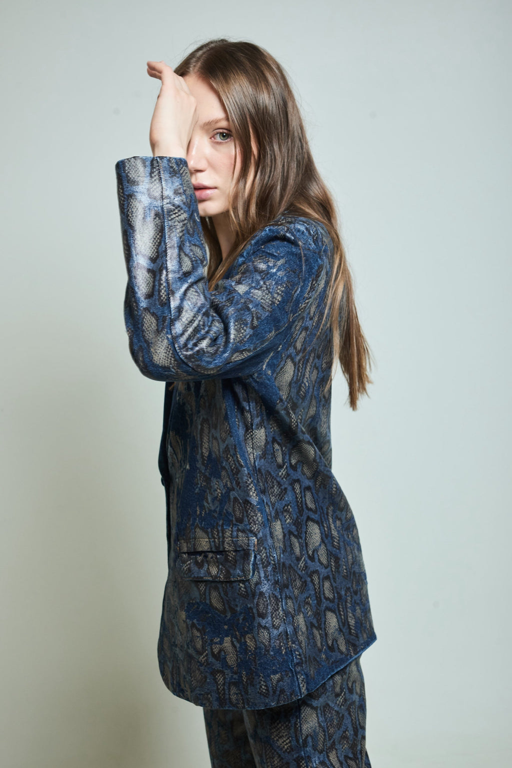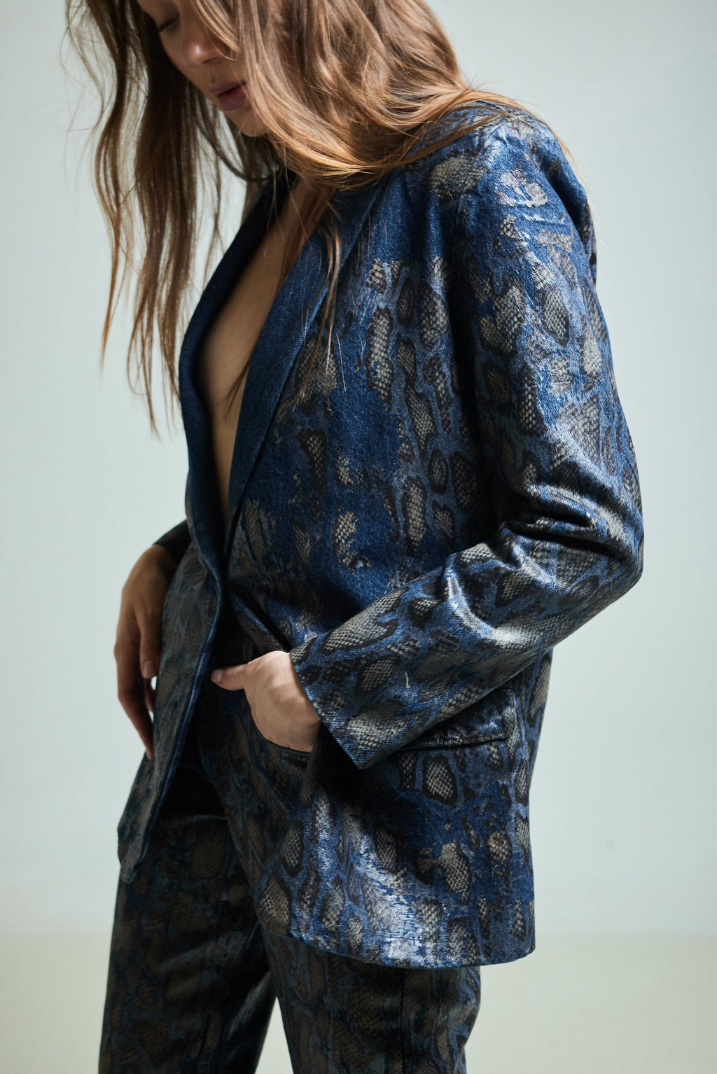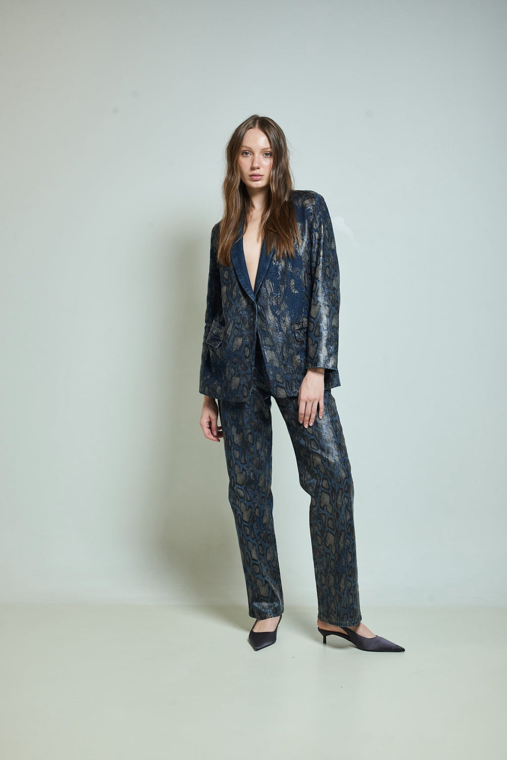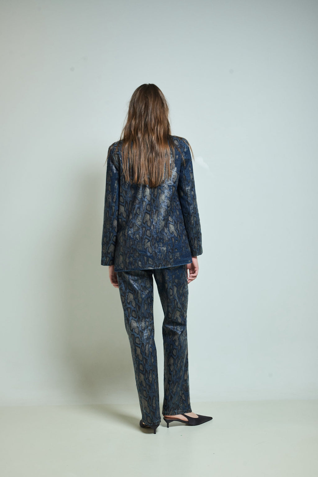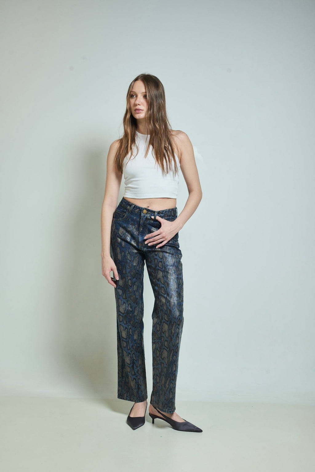 Pantalón recto de denim con efecto foil pitón, pretina y pasadores, sistema de cierre frontal con cremallera y botón, bolsillos delanteros y de parche traseros.